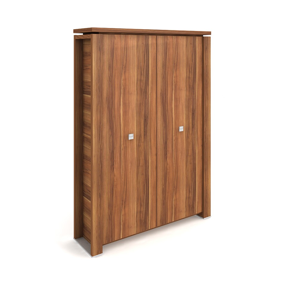 Kancelárska skriňa policová s vešiakom, drevené dvere. Ako všetky skrine línie EXPO+ je charakteristická odľahčenou rámovou konštrukciou, ktorá je dizajnovo zhodná s nohami stolov línie EXPO+. Horné a spodné dno, boky, police a zvislé priečky skrine sú vyrobené z drevotrieskovej dosky hrúbky 38 mm, chrbát a dvere sú hrubé 18 mm. Všetky hrany u skríň a políc sú olepené 2 mm ABS hranou, sú výškovo polohovateľné a ku korpusu sú uchytené systémom, ktorý zároveň skriňu spevňuje. Dvere sú vložené, doplnené sklopnou úchytkou v niklovom prevedení, sú vybavené 2mm ABS hranou, kovaním BLUM s doživotnou zárukou a plynulé zatváranie zaisťujú integrované tlmiče. Na dverách môžu byť nainštalované zámky s diaľkovým elektronickým ovládaním. Tieto kancelárske skrine je možno použiť aj ako priestorový deliaci prvok, nakoľko chrbát je obojstranne pohľadový. Rovnako ako stoly, majú v boku skrine ukryté rektifikácie na vyrovnanie nerovností podláh. Za prvými dverami vľavo sa nachádza priestor určený na vešanie krátkych kabátov alebo sák. Skriňa zodpovedá normám ČSN EN 14073-2, ČSN EN 14073-3, ČSN EN 14749, ČSN 910001 a ČSN 910100.